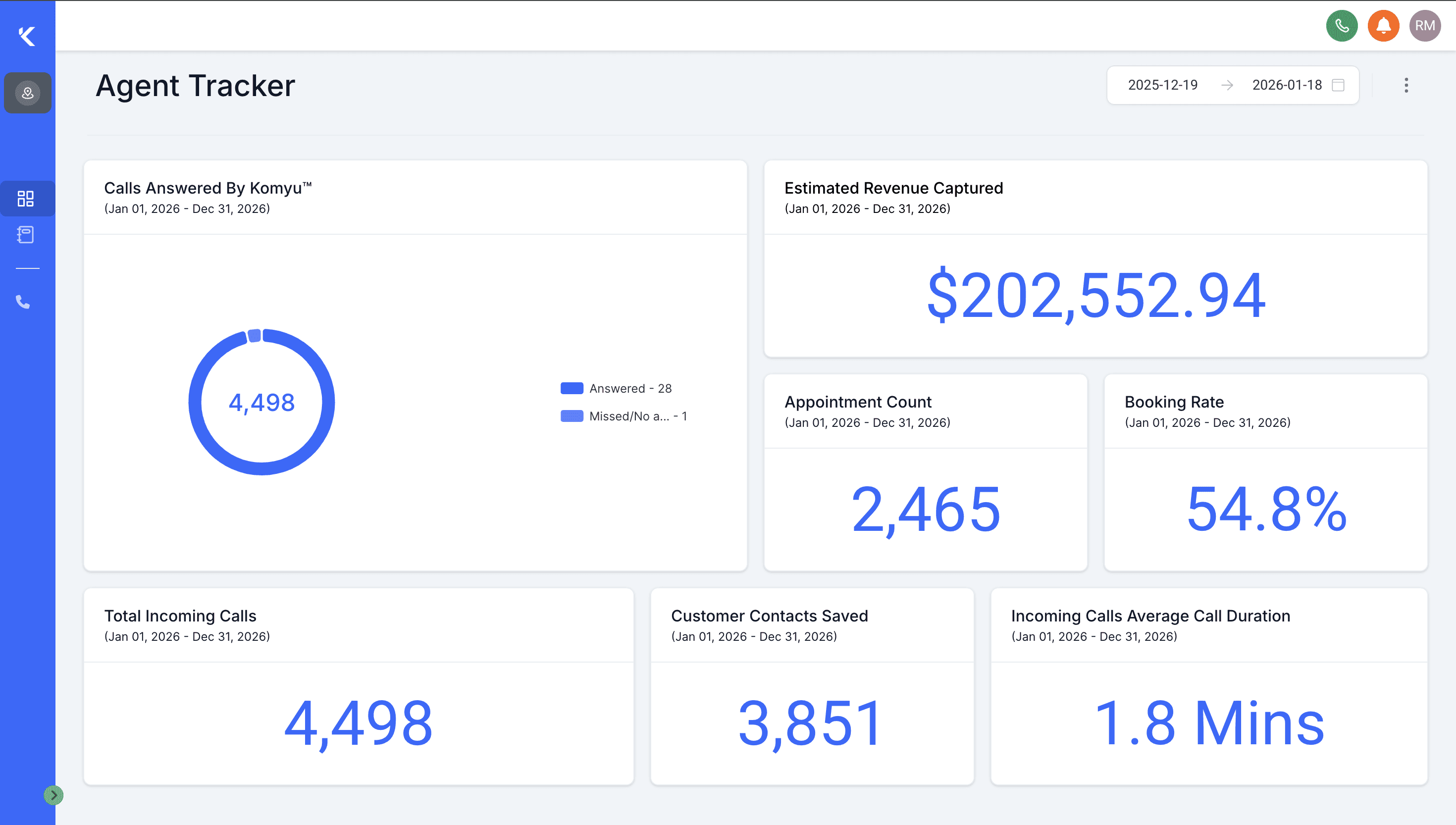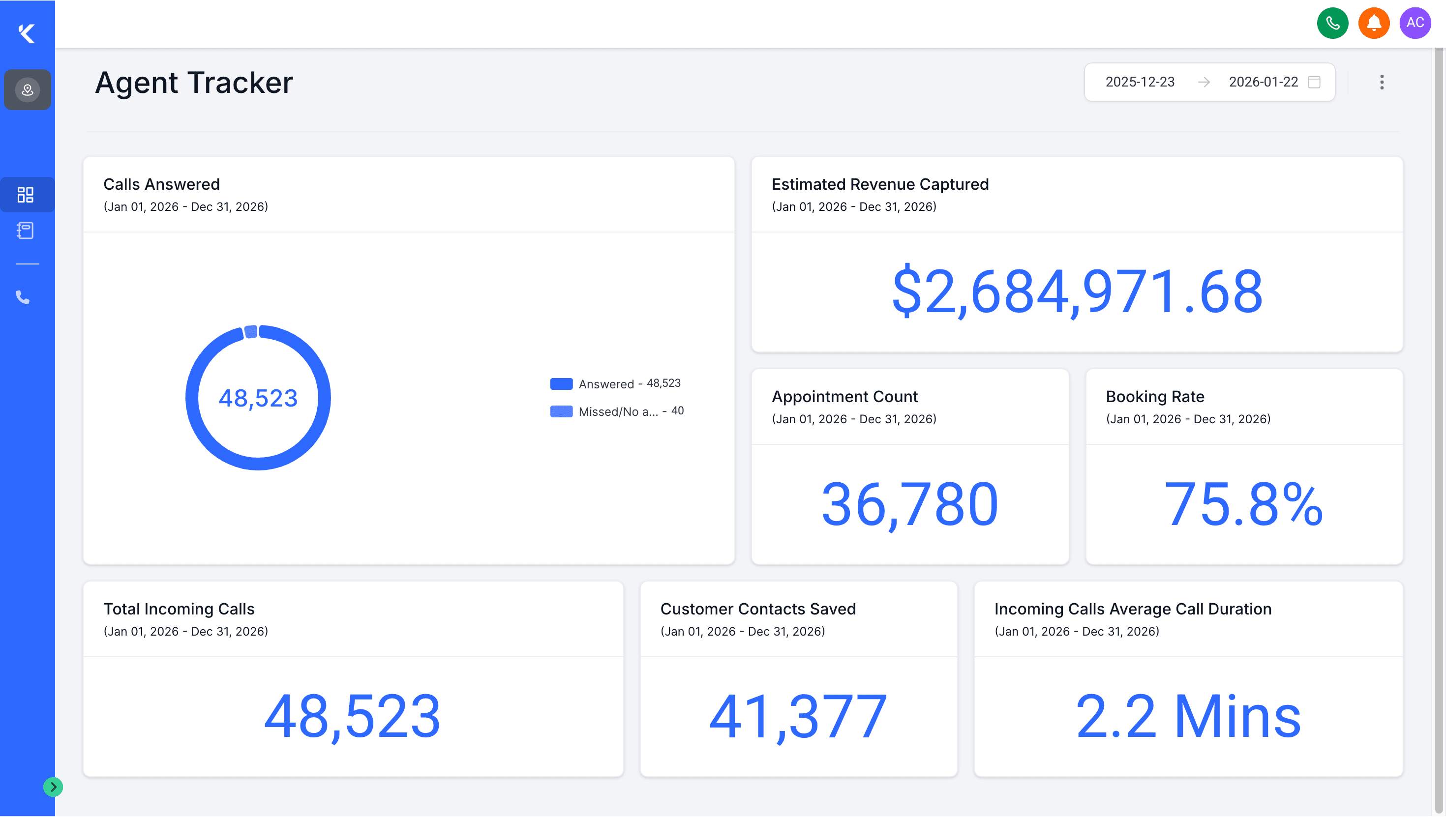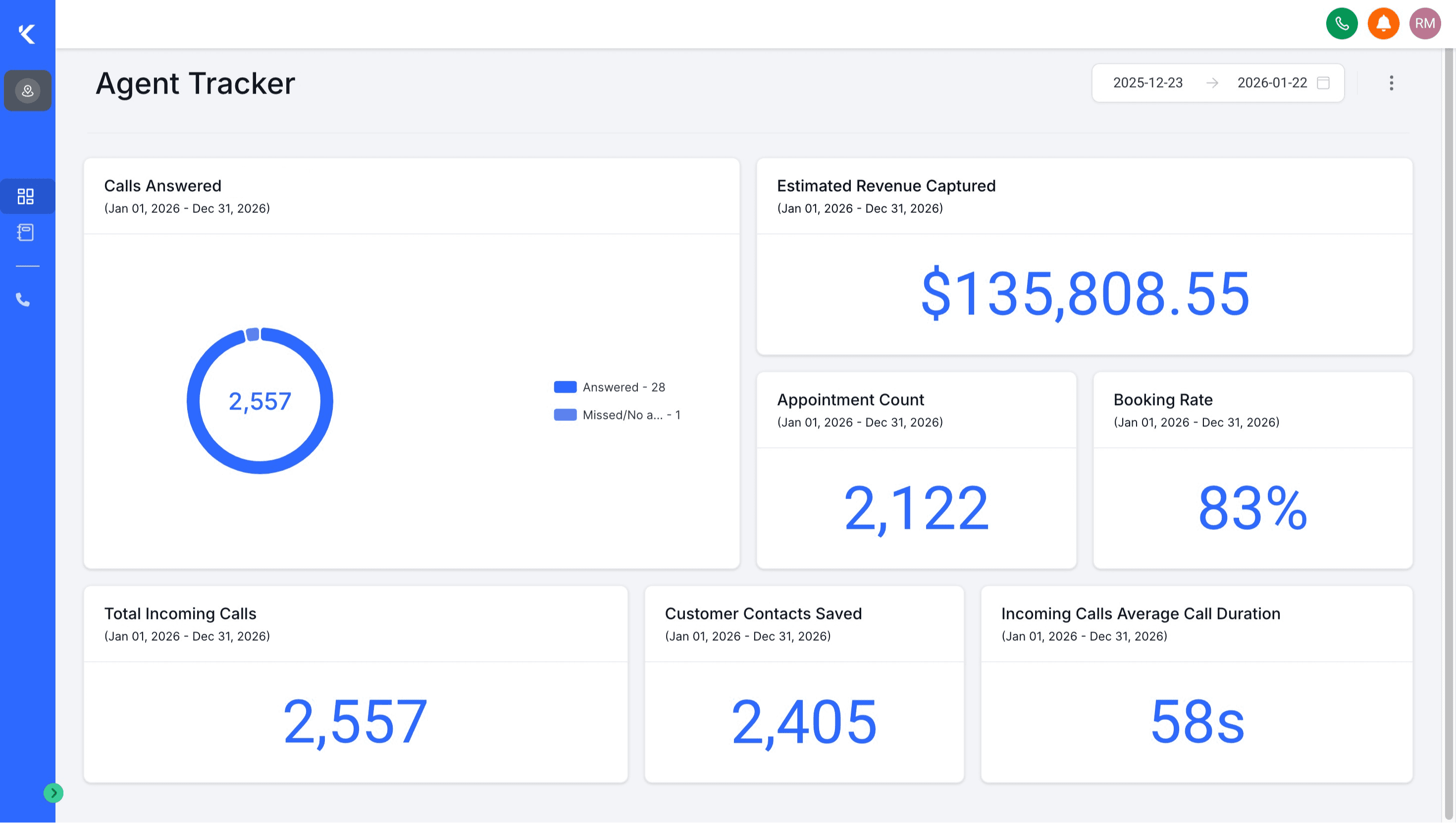 Track call volume, missed calls, bookings, conversions, and revenue impact from a live dashboard.